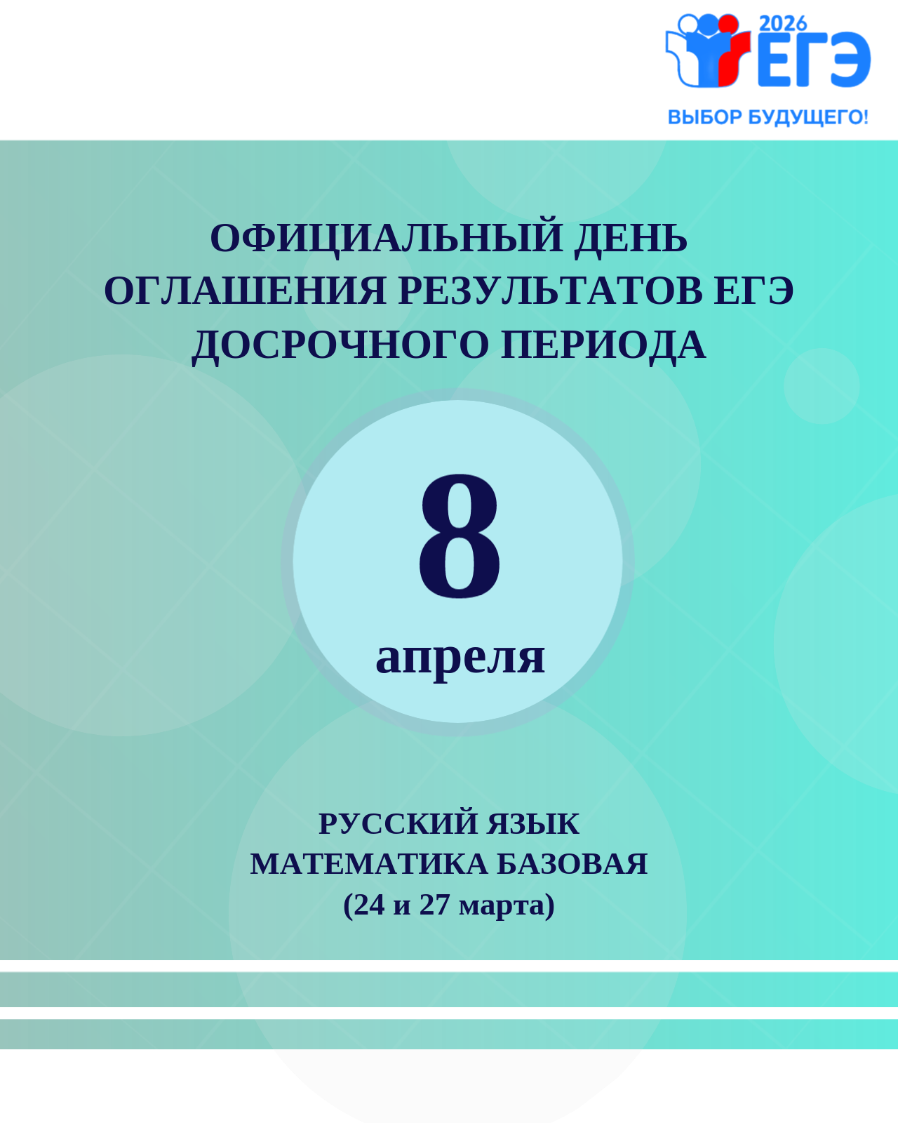 Информируем вас о том, что 8 апреля 2026 года является официальным днём оглашения результатов участников досрочного периода ЕГЭ по русскому языку и математике базового уровня.